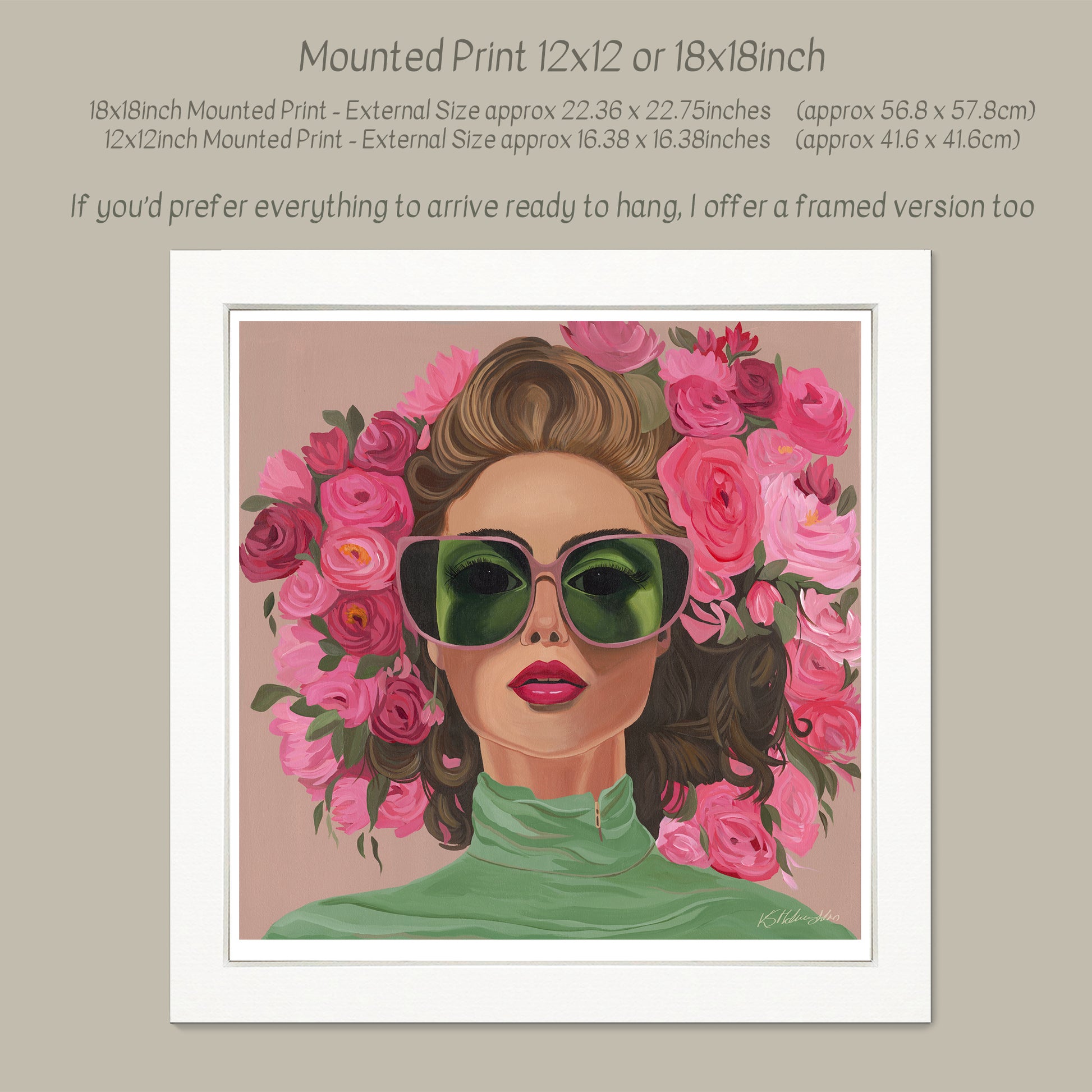 A bold, contemporary print featuring a woman in oversized sunglasses, framed by a rich surround of pink roses. Strong colour, clean lines, and a slightly playful glamour give this piece a confident, modern presence on the wall.