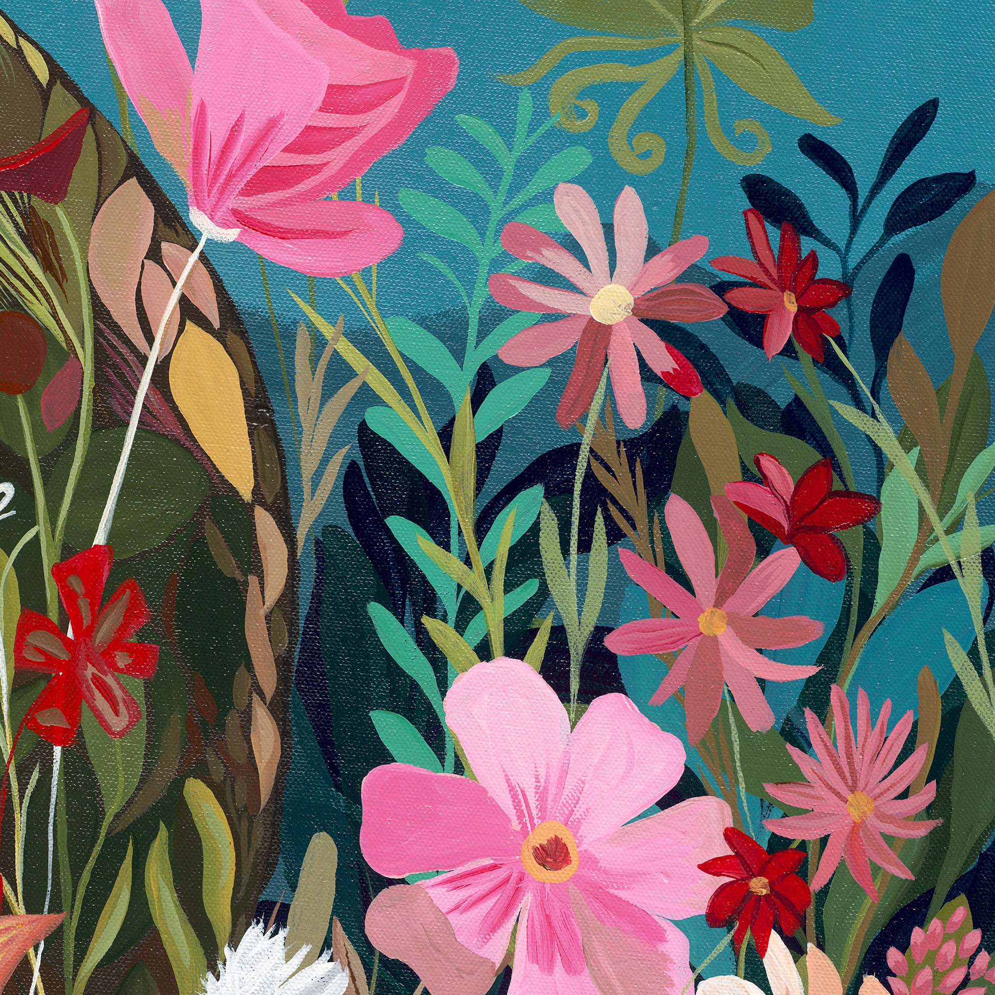 A lively print featuring a hare surrounded by an abundant mix of wildflowers, set against a bright blue background. Bold colour, layered detail, and a sense of gentle humour give this piece an uplifting, decorative presence on the wall.