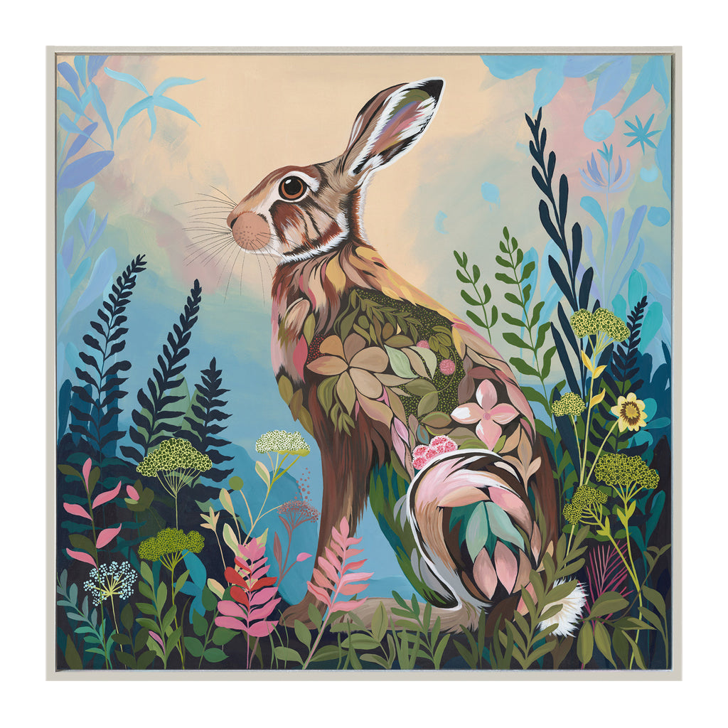 Cowslip Sky is an original acrylic painting on canvas, depicting a hare standing quietly within a layered meadow of foliage and flowers.