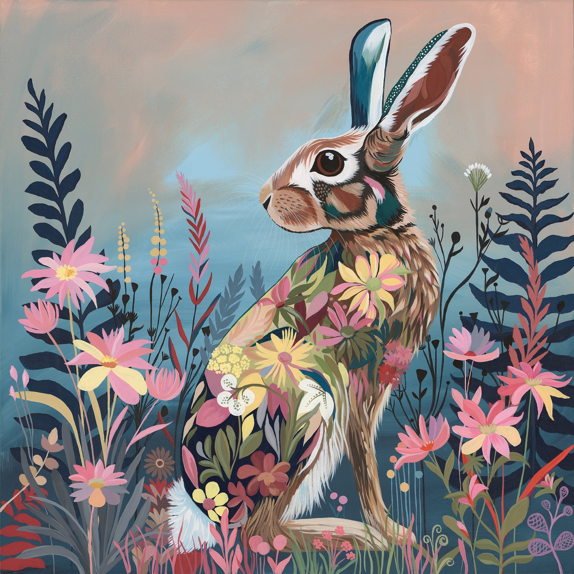Dawnshadow is an original acrylic painting of a thoughtful hare standing among soft pink meadow flowers and deep, inky foliage, set against a gentle dawn-blue sky. The hare’s coat is layered with painterly marks and floral motifs, blending him seamlessly into the garden around him. There’s a sense of early morning stillness in this piece, with cool blues and muted neutrals offset by warm pinks and soft yellows.