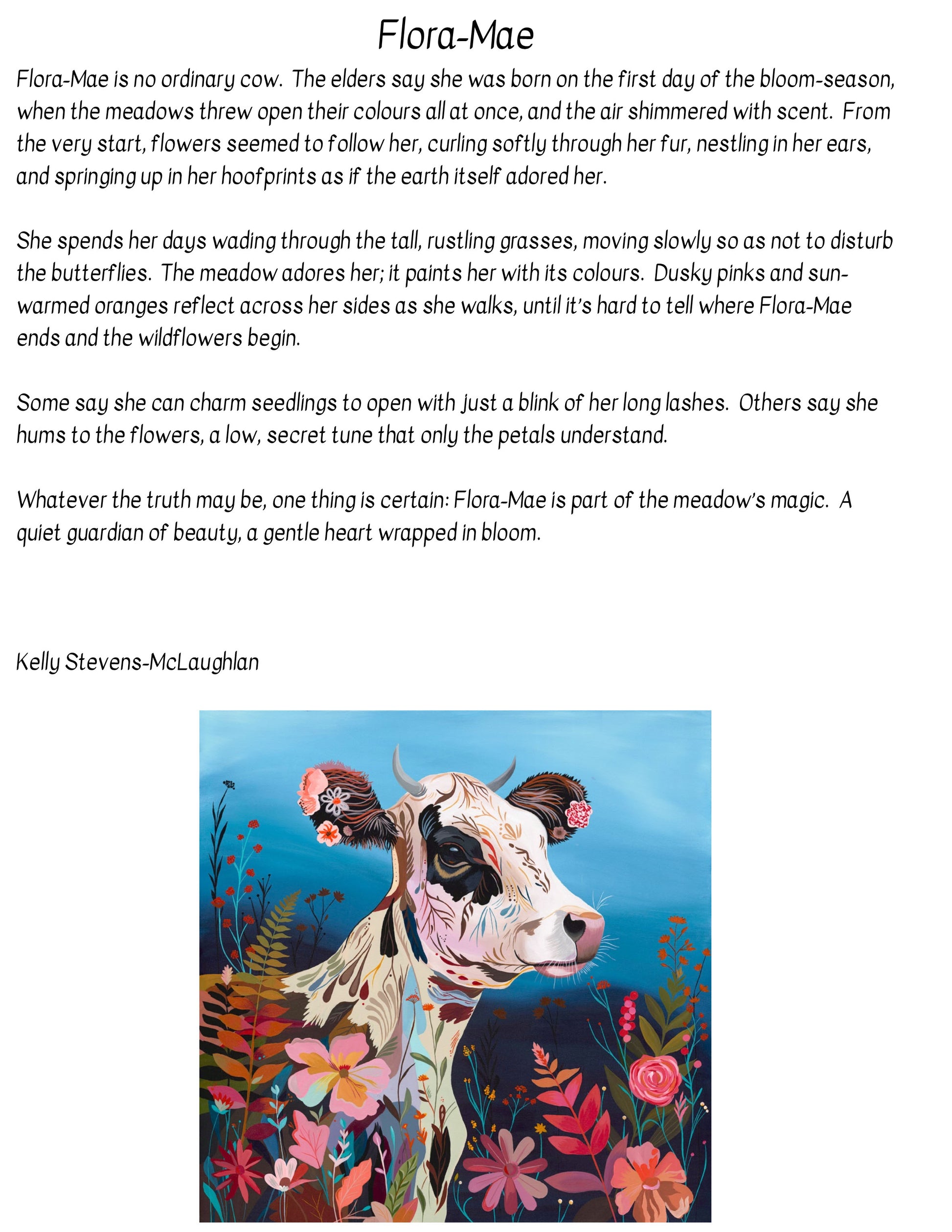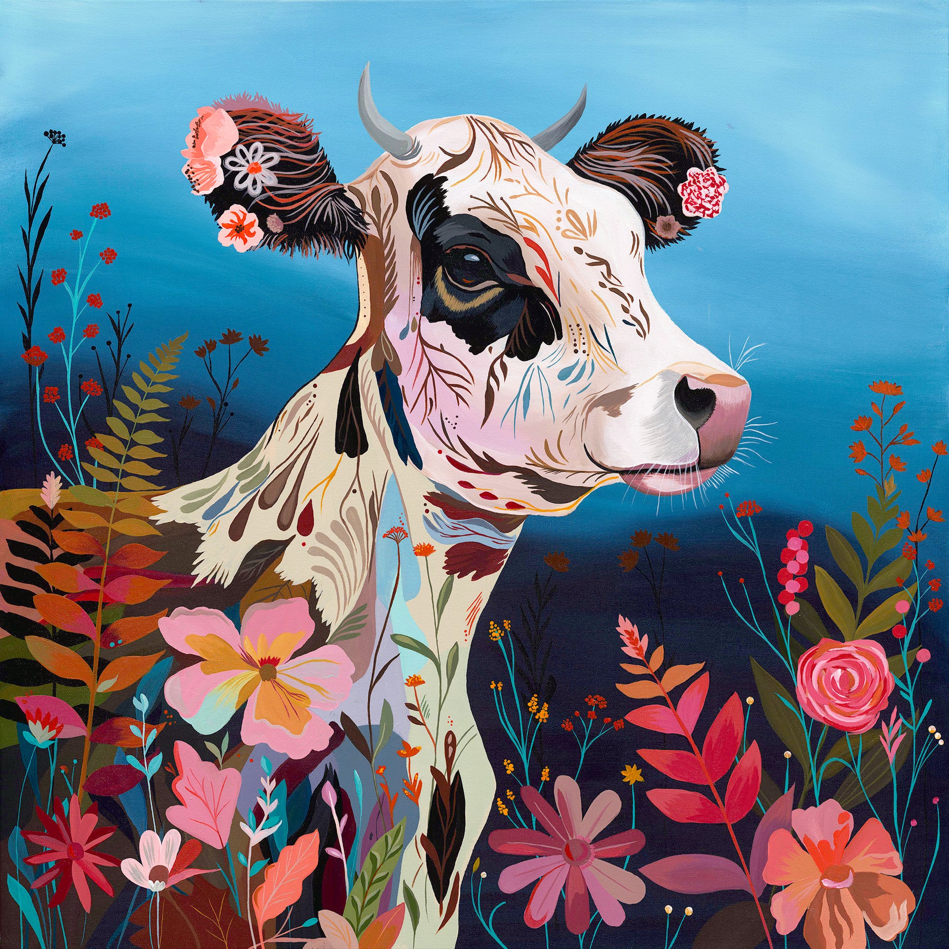 Flora Mae is an original acrylic painting on canvas, depicting a young cow standing within a richly patterned meadow of flowers and foliage.