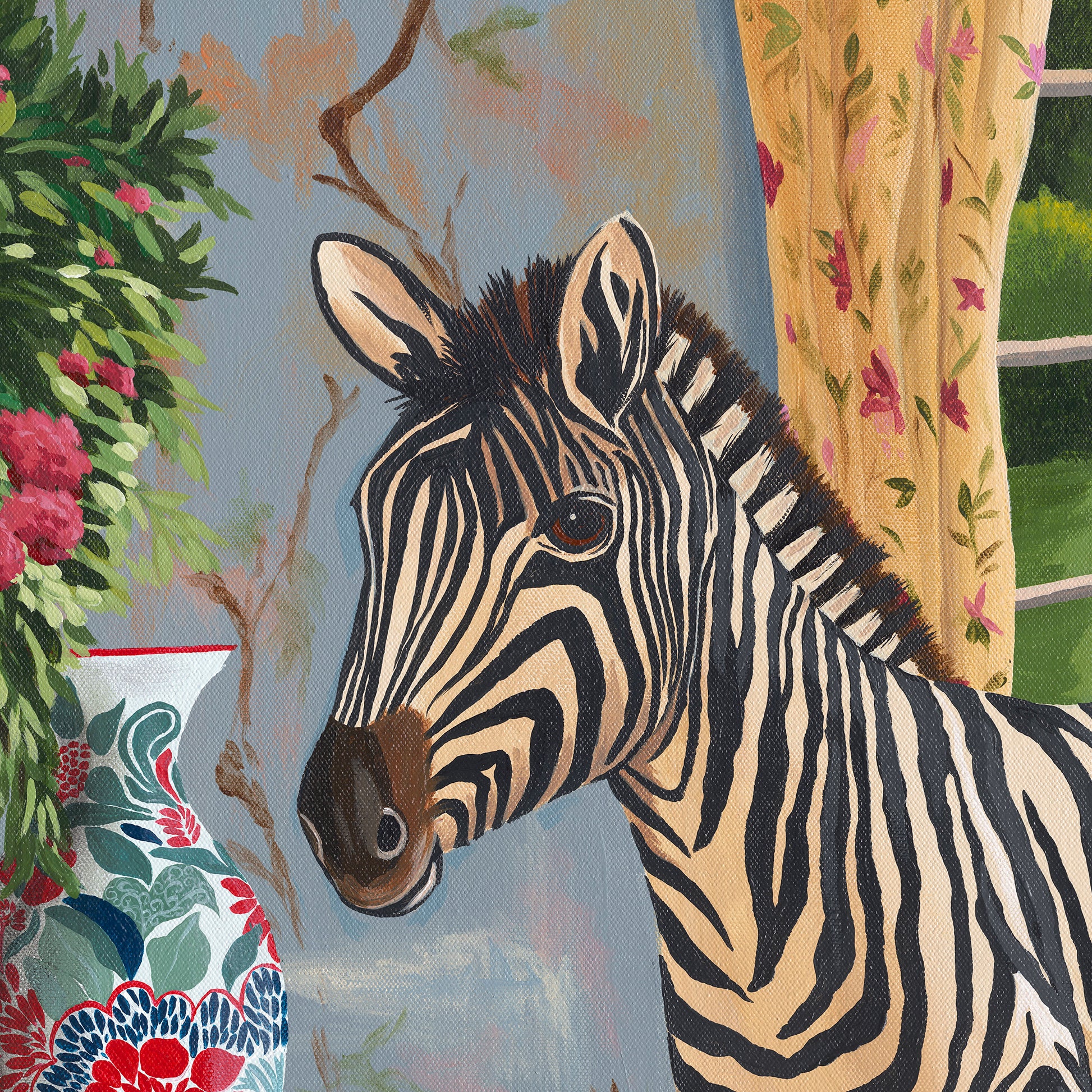 A richly detailed print featuring a hare nestled among layered foliage and softly coloured florals. The muted palette and intricate patterning create a sense of depth and shelter, giving the piece a calm, settled presence.