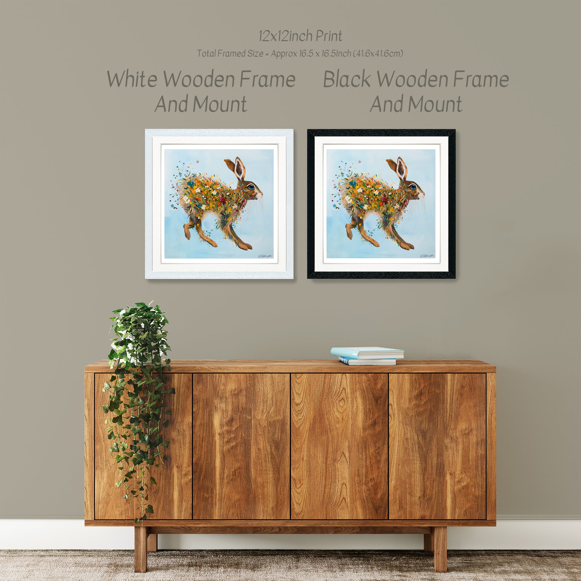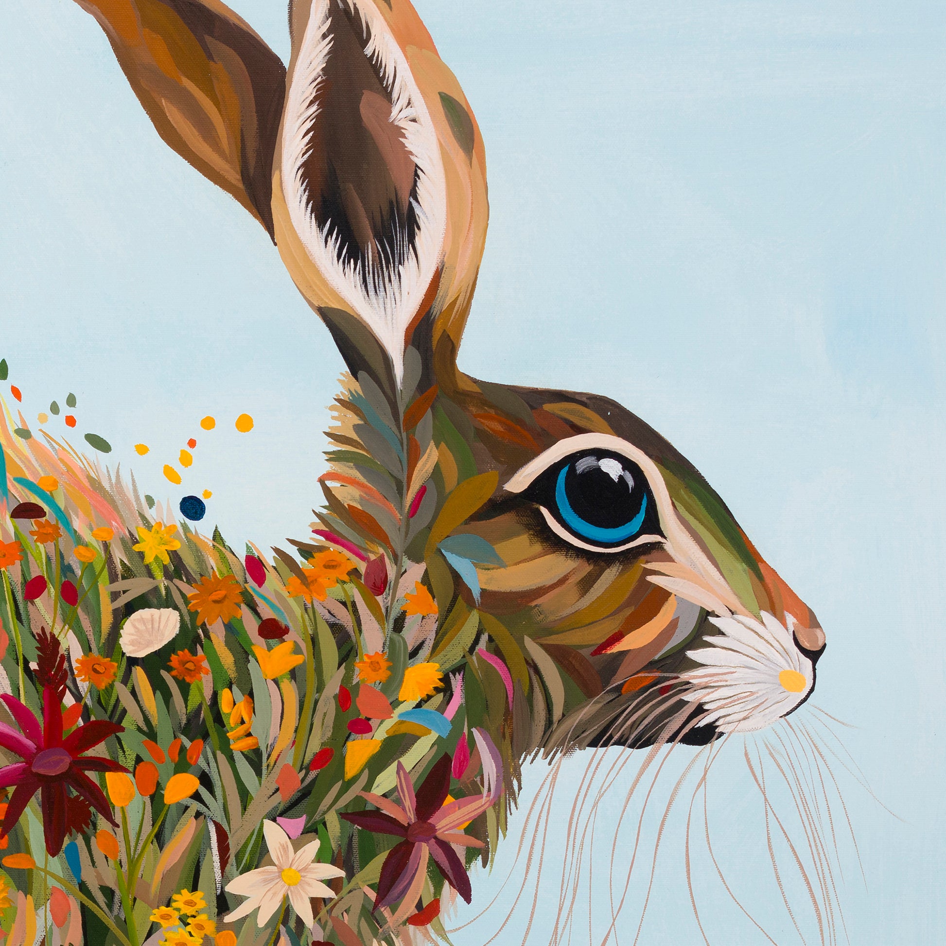 A joyful print featuring a hare adorned with a lively scattering of wildflowers, set against a soft, airy background. Bold colour, flowing movement, and fine detail give this piece an energetic, celebratory feel on the wall.