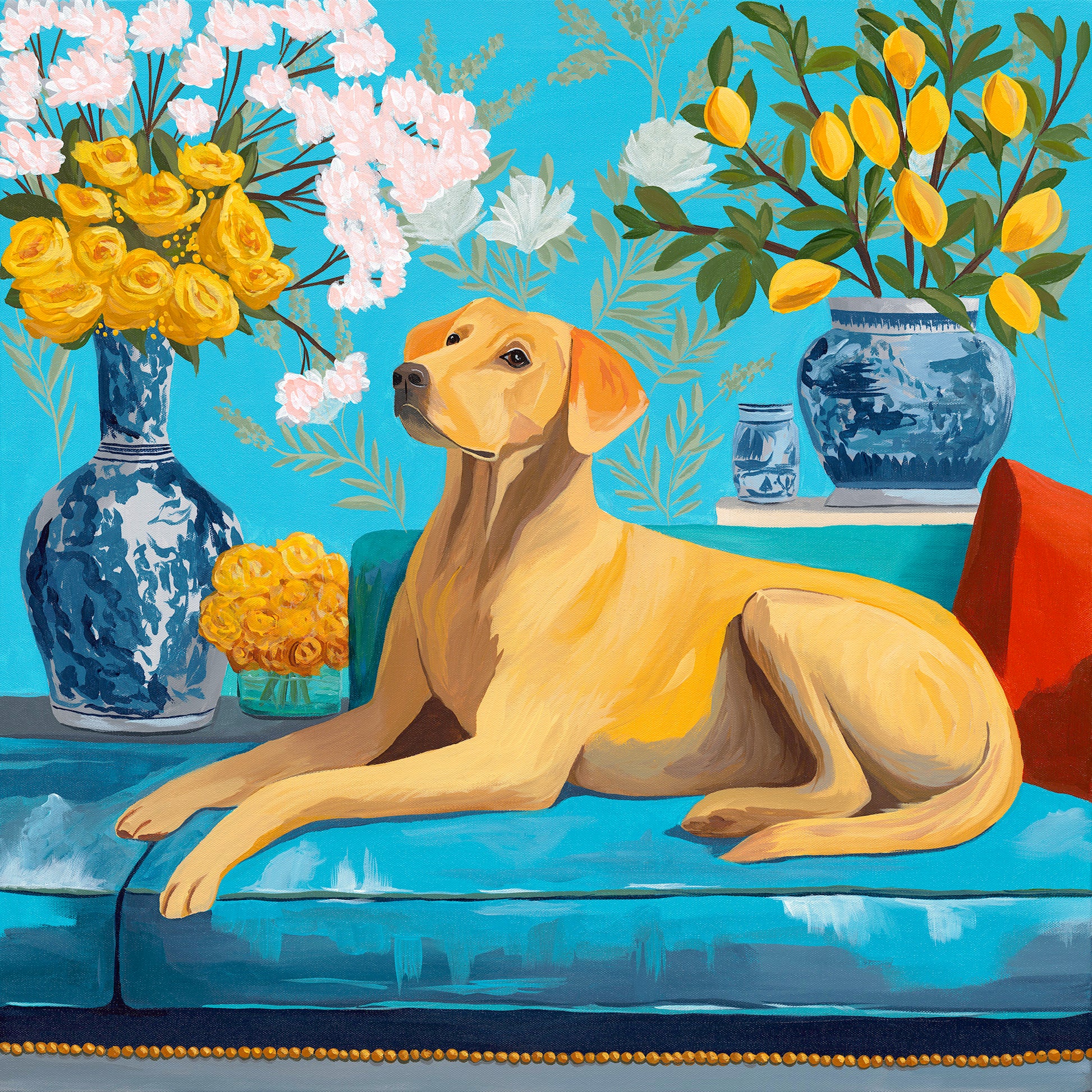 Lemon Grove Guest is an original acrylic painting of a calm, reclining Labrador resting on a cool blue sofa, surrounded by abundant florals, patterned ceramics, and branches of bright yellow lemons. The palette is fresh and sunlit, with citrus yellows, leafy greens, and crisp blues creating a sense of warmth without heaviness. There’s an easy elegance to the scene, as if this dog has simply wandered in from the garden and decided to stay awhile.