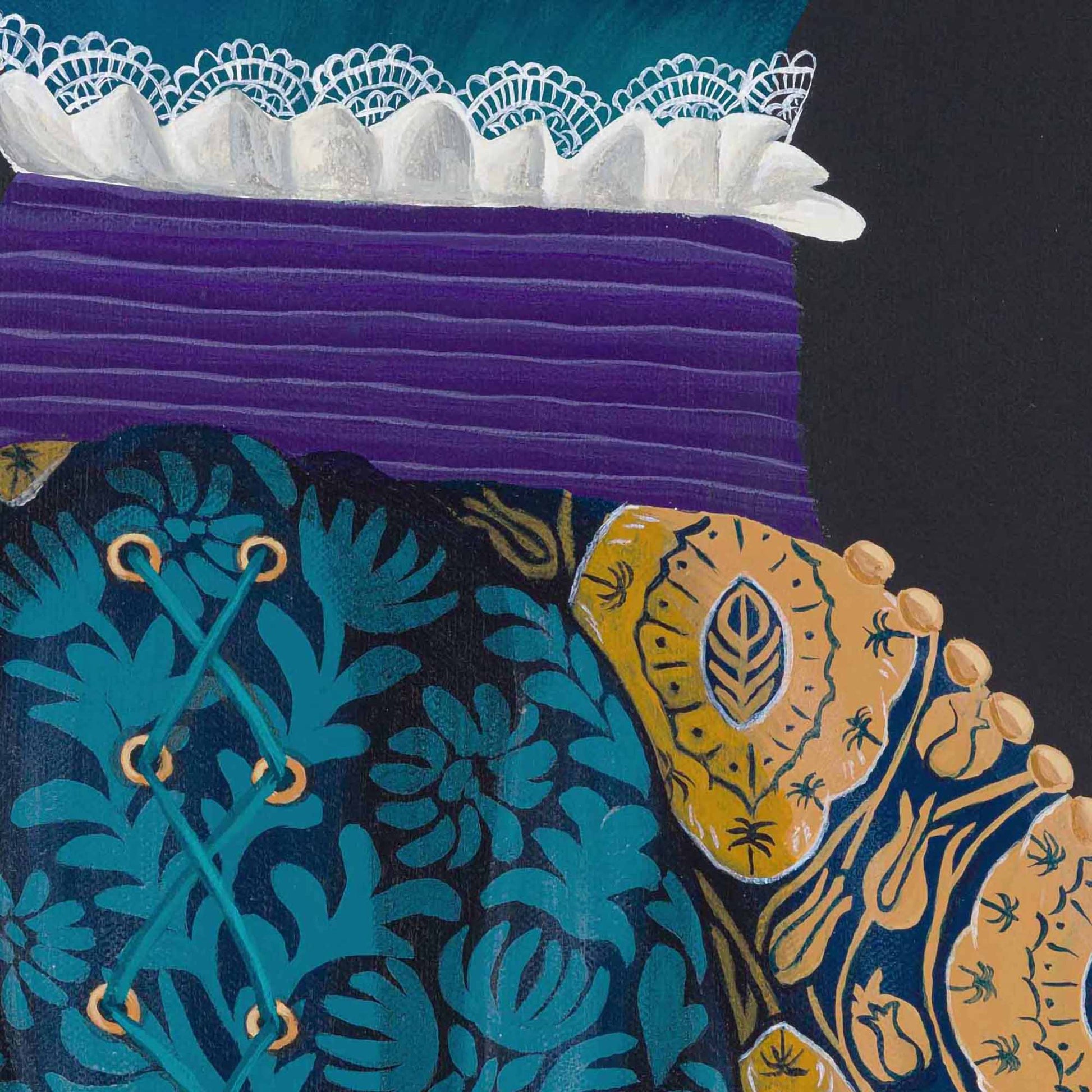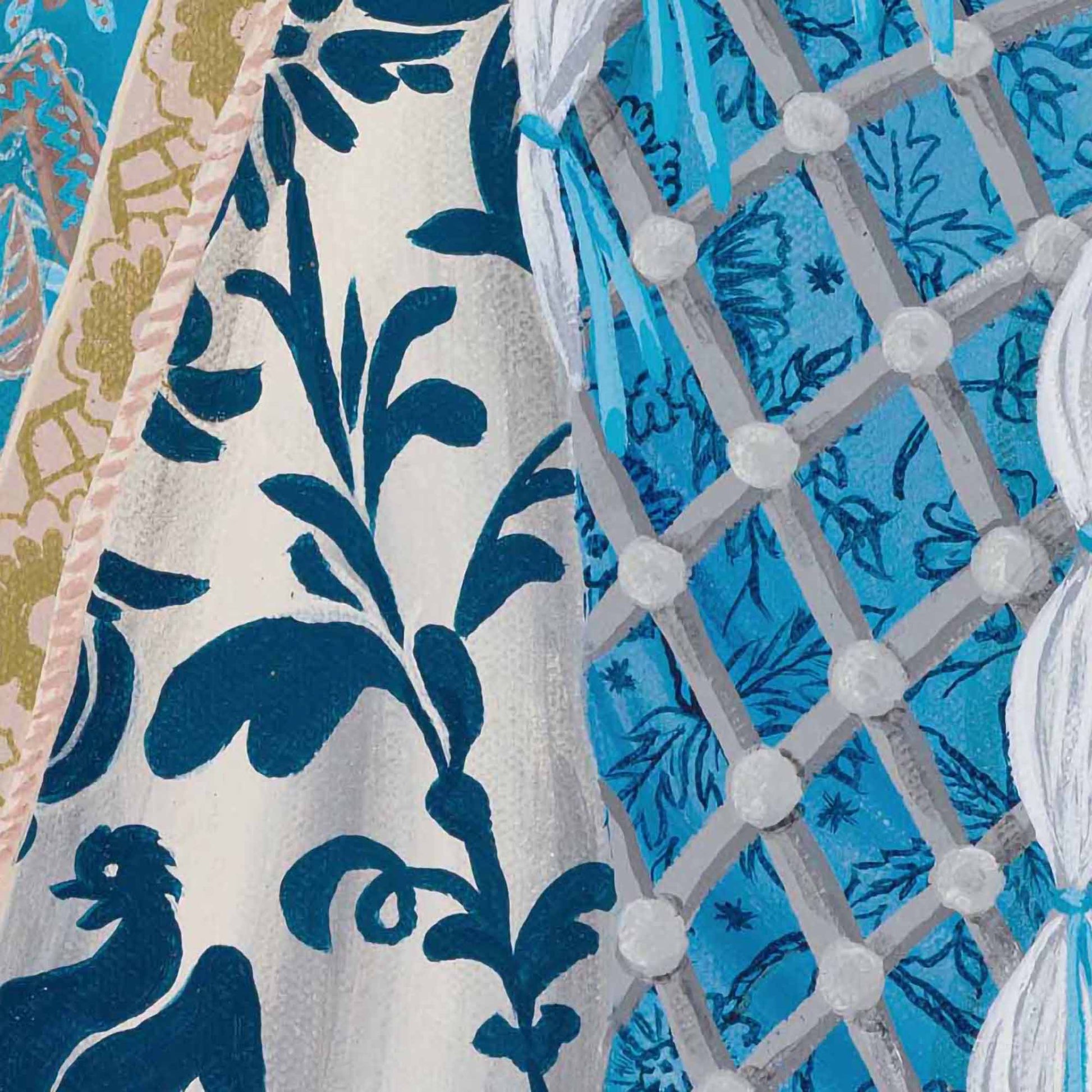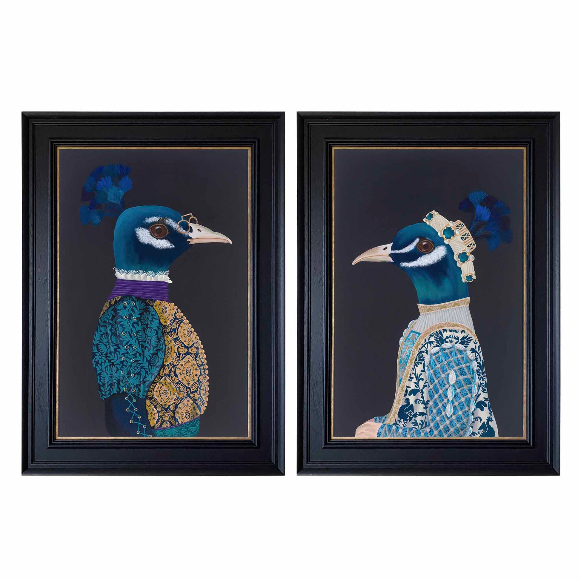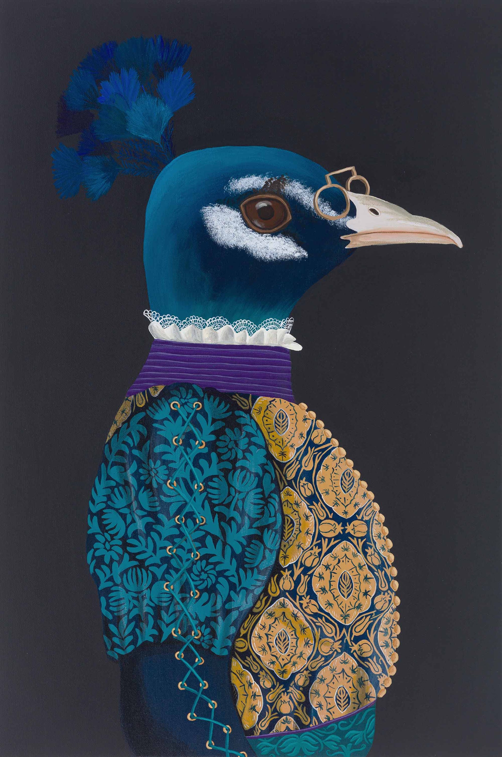 The work consists of two individual paintings conceived as a single piece and sold together. Shown in profile, the paired peacocks face one another across the divide, their elaborate dress and composed expressions suggesting an underlying imbalance of power. Rich pattern and layered symbolism draw on medieval visual language, where costume and adornment conveyed status, virtue, and vice.