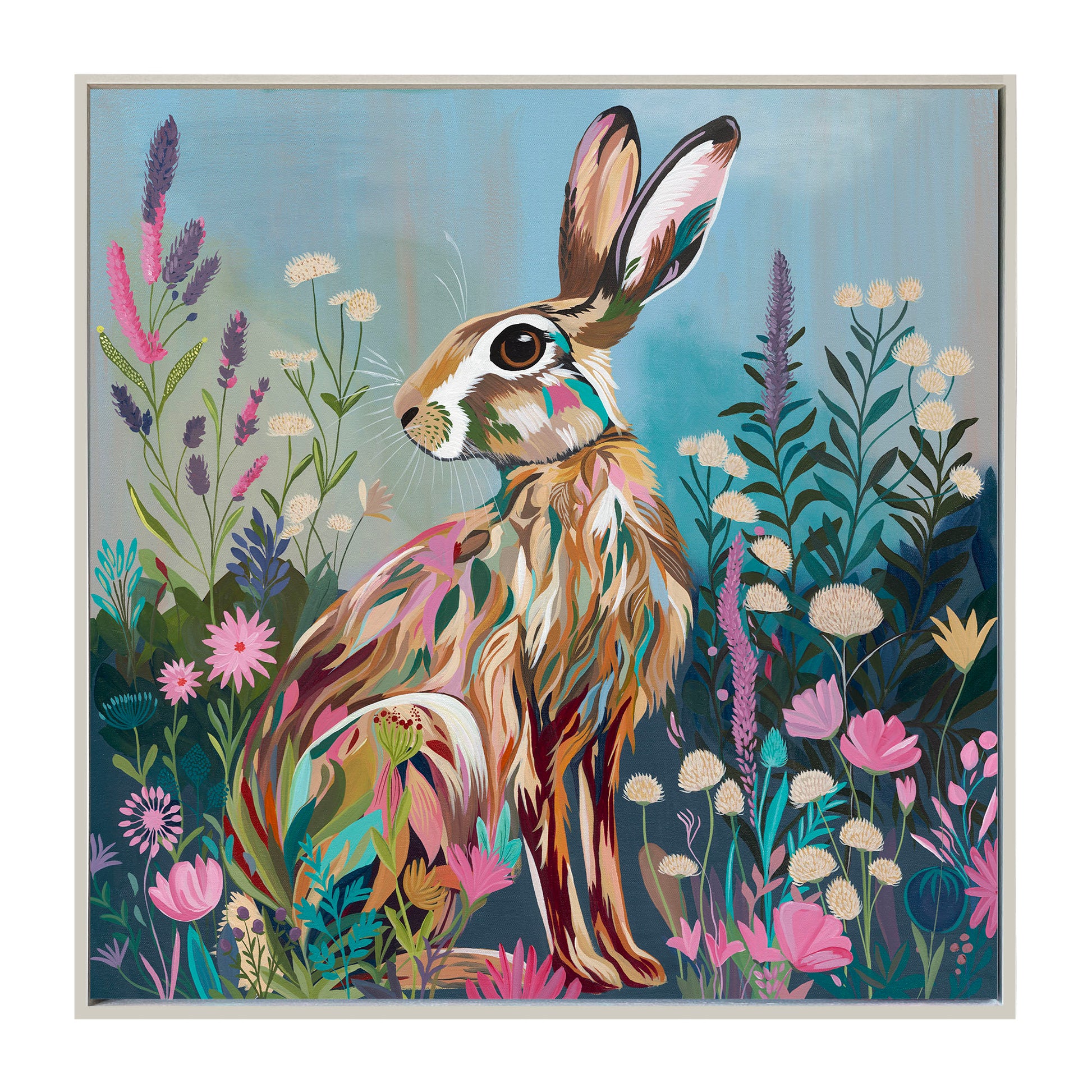 Pathfinder is an original acrylic painting featuring a hare standing alert among tall grasses and wildflowers, set against a softly layered sky in muted blue and green tones. Painted with expressive brushwork and intricate patterning, the hare appears poised and attentive, as though navigating its way through a quiet, imagined landscape filled with colour and movement.
