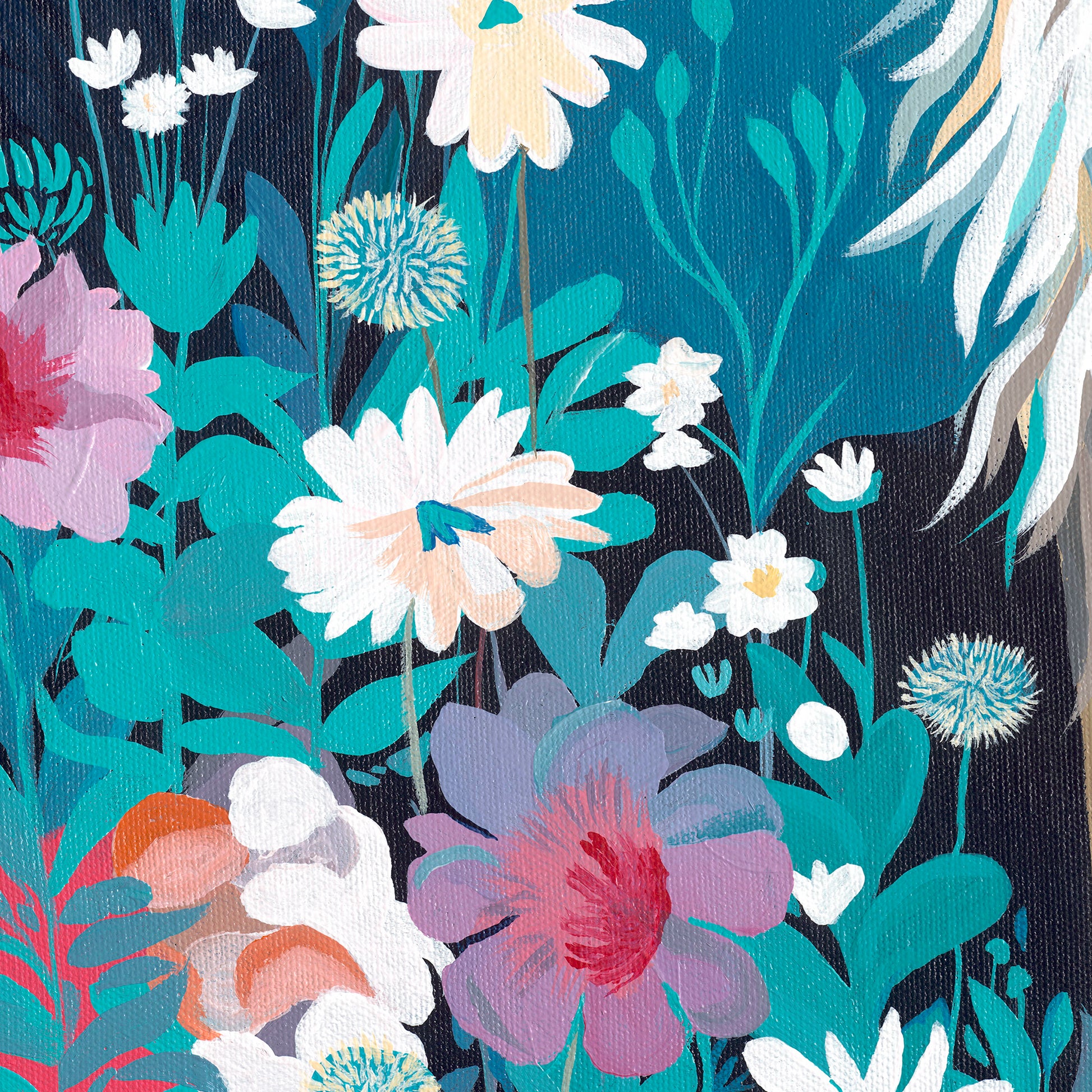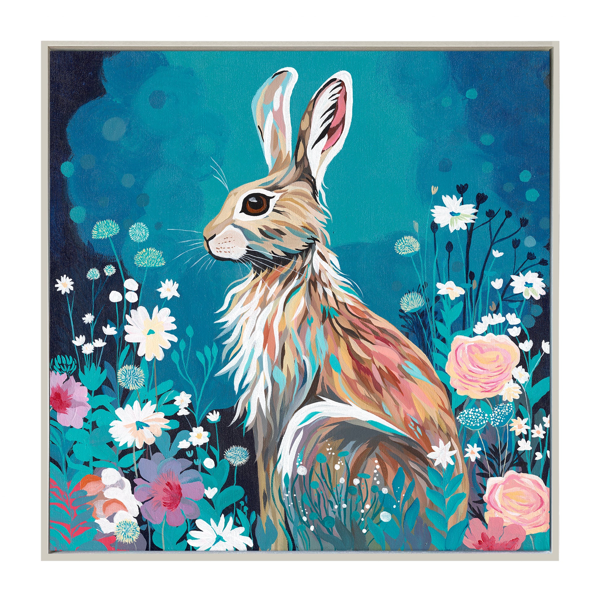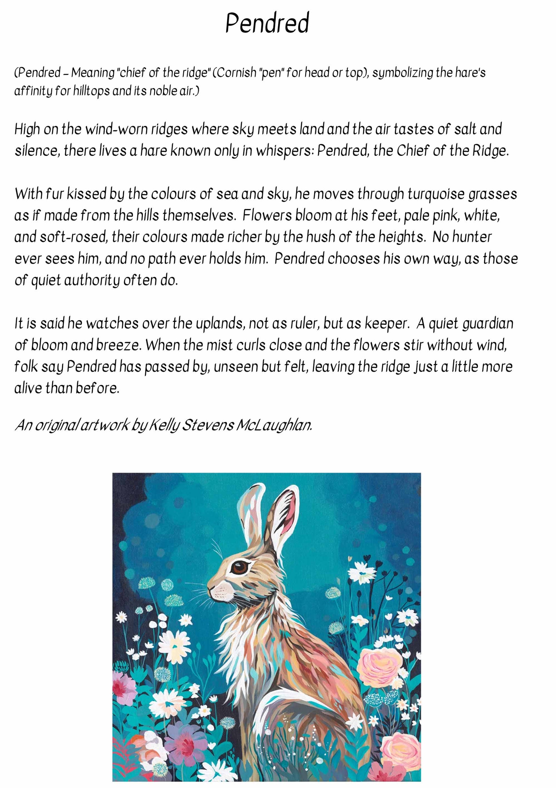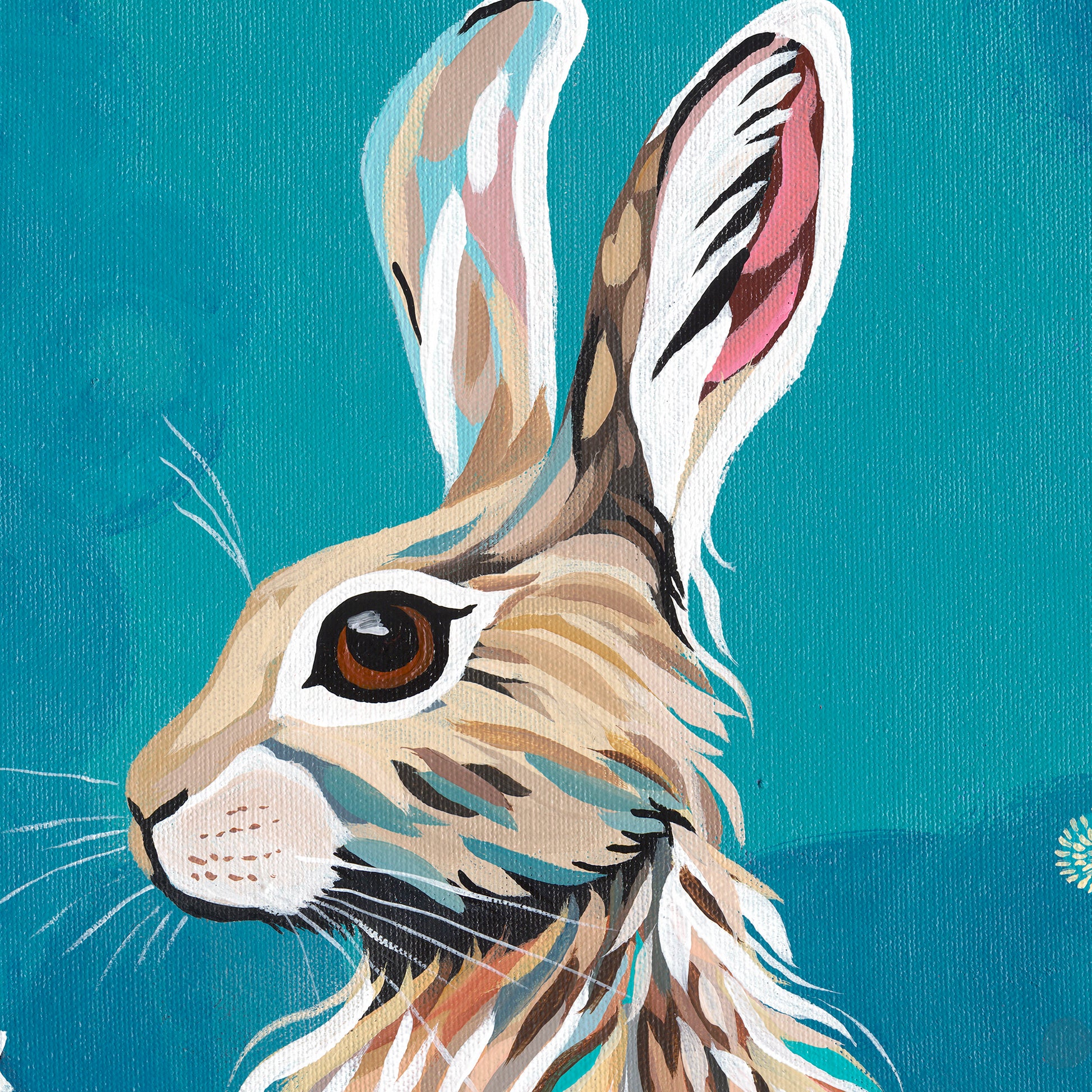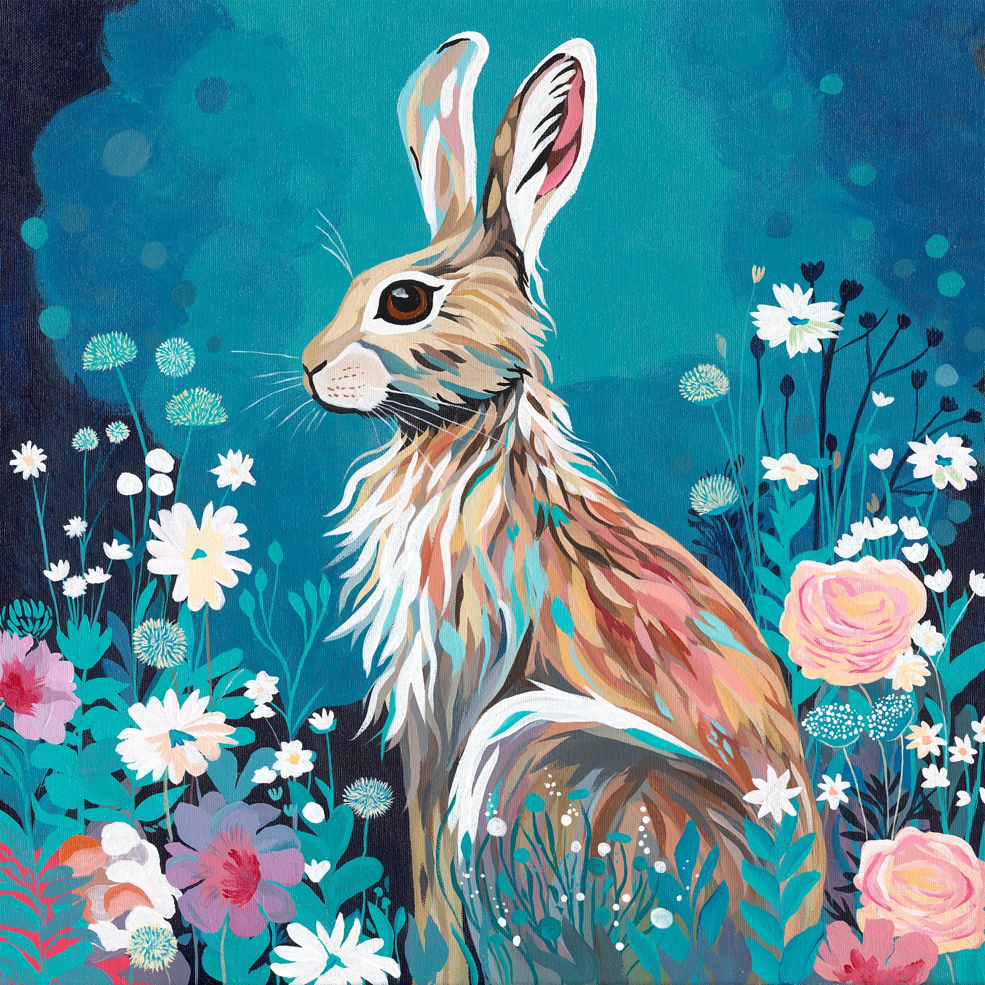 Pendred is an original acrylic painting on canvas, featuring a hare poised among layered foliage and flowers in cool blues, greens, and soft pinks.