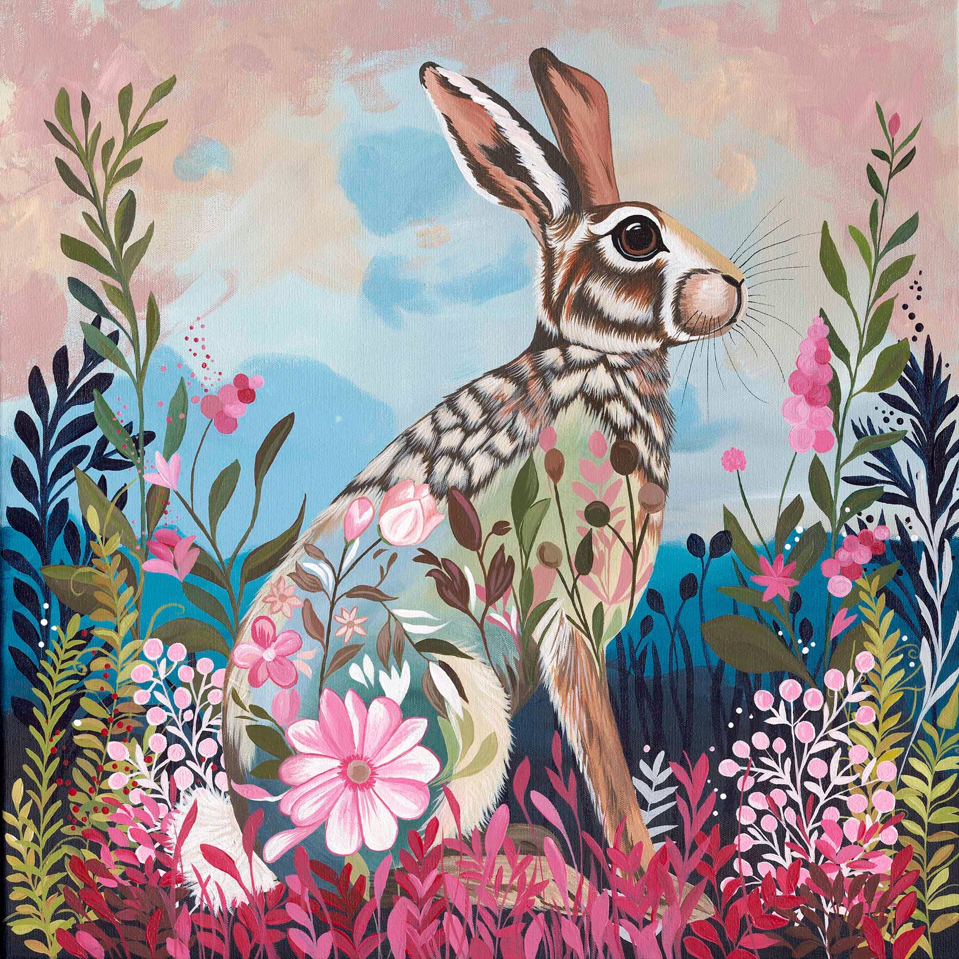 Rosebrim is an original acrylic painting of a serene hare standing among layered meadow flowers and softly painted foliage, set against a pale sky with gentle washes of blue and blush. The hare’s coat is patterned with delicate markings that echo the shapes of the plants around him, giving the piece a harmonious, almost woven feel. There’s an airy calm to this painting, balanced by the richness of the pinks, deep reds, and cool greens gathered at his feet.