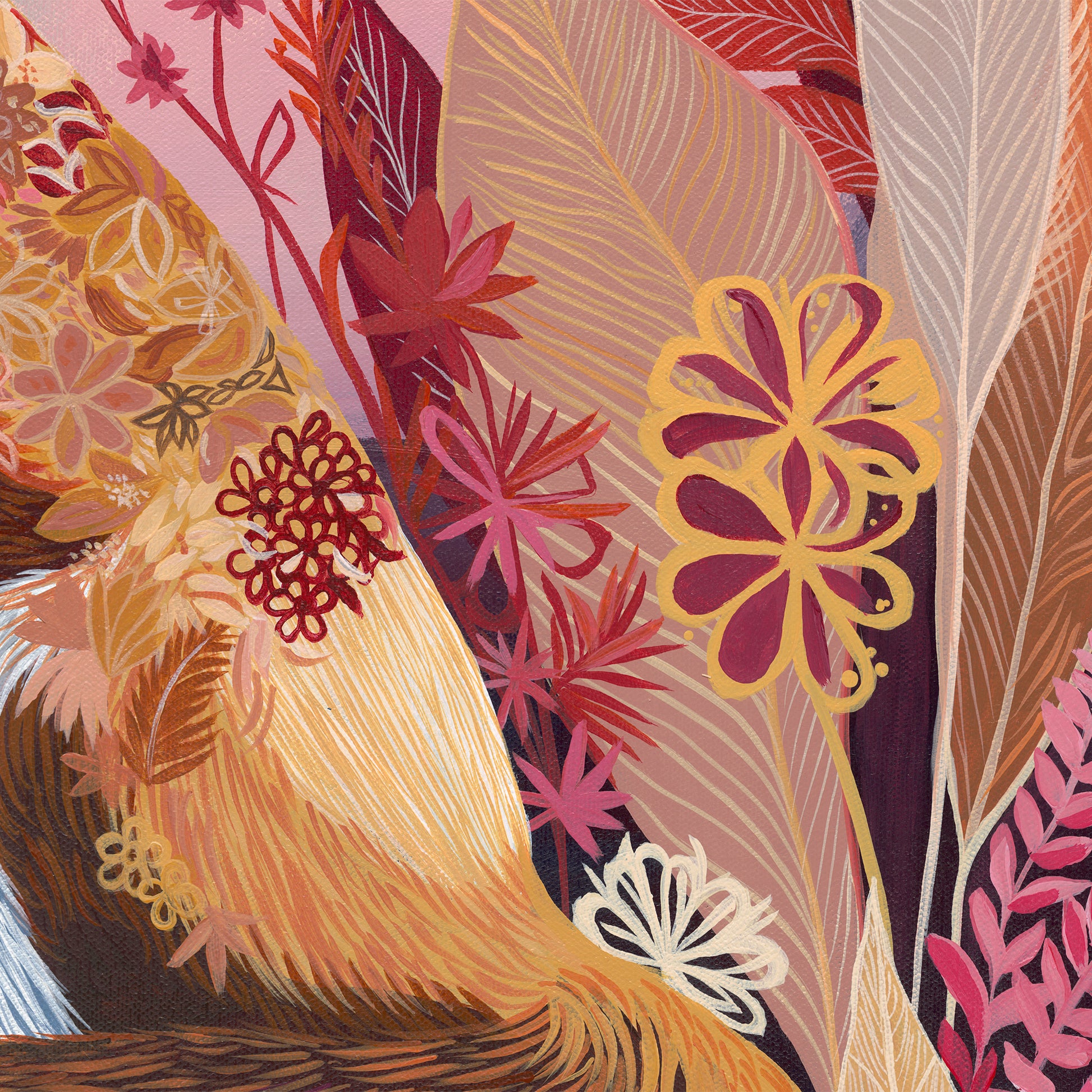 The Fox Who Waits is an original acrylic painting on canvas, featuring a seated fox surrounded by layered foliage in warm, autumnal tones.