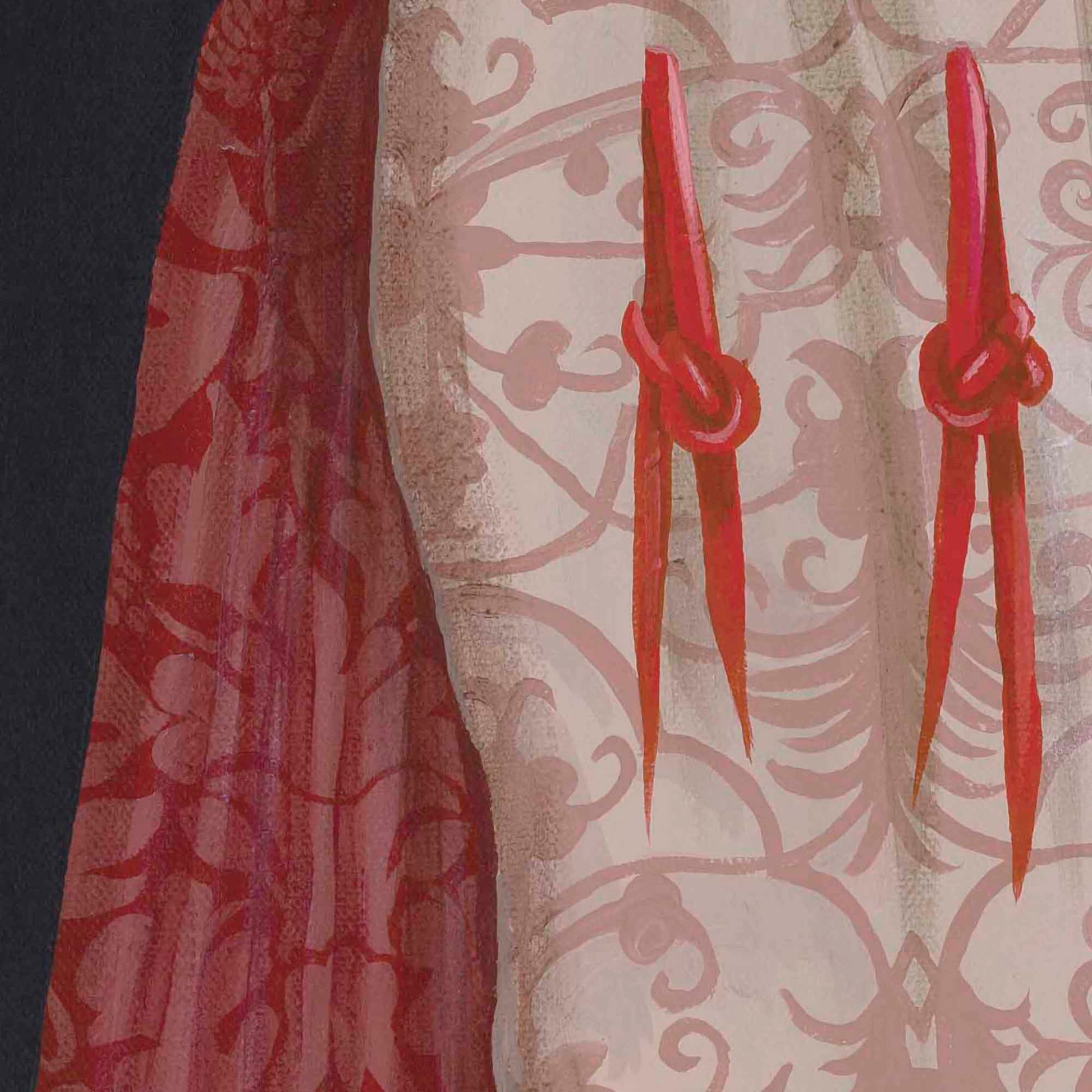 The work consists of two individual paintings conceived as a single piece and sold together. Shown in profile and facing one another, the paired geese present an outward sense of union and harmony, while subtle details in their dress and posture suggest a more complicated reality beneath the surface. Decorative pattern and symbolic motifs draw on medieval visual language, where clothing and adornment conveyed status, fortune, and fate.