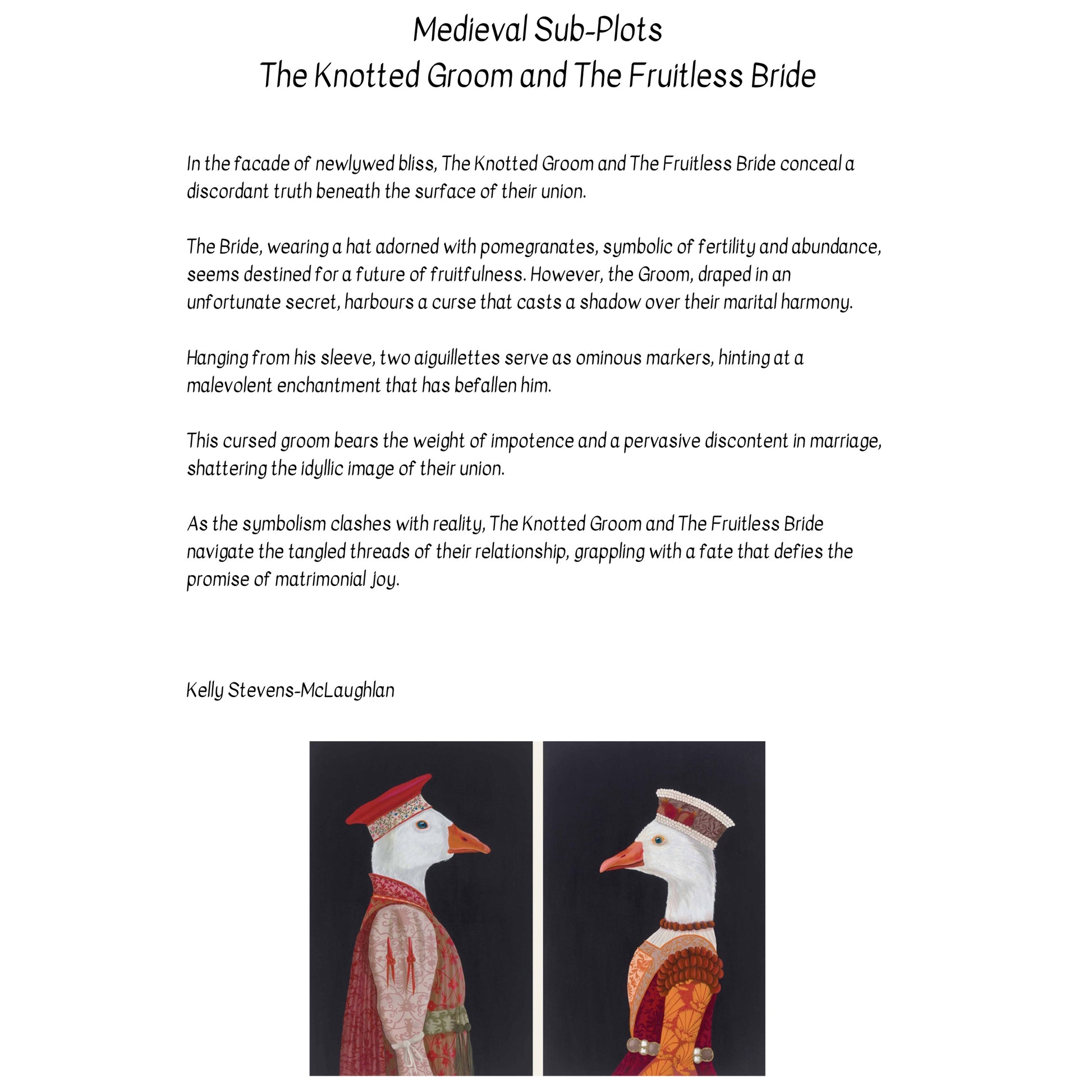 The Knotted Groom and The Fruitless Bride is an original painted diptych from my Medieval Sub-Plots series, which explores marriage, morality, secrecy, and social expectation through birds depicted in medieval costume.