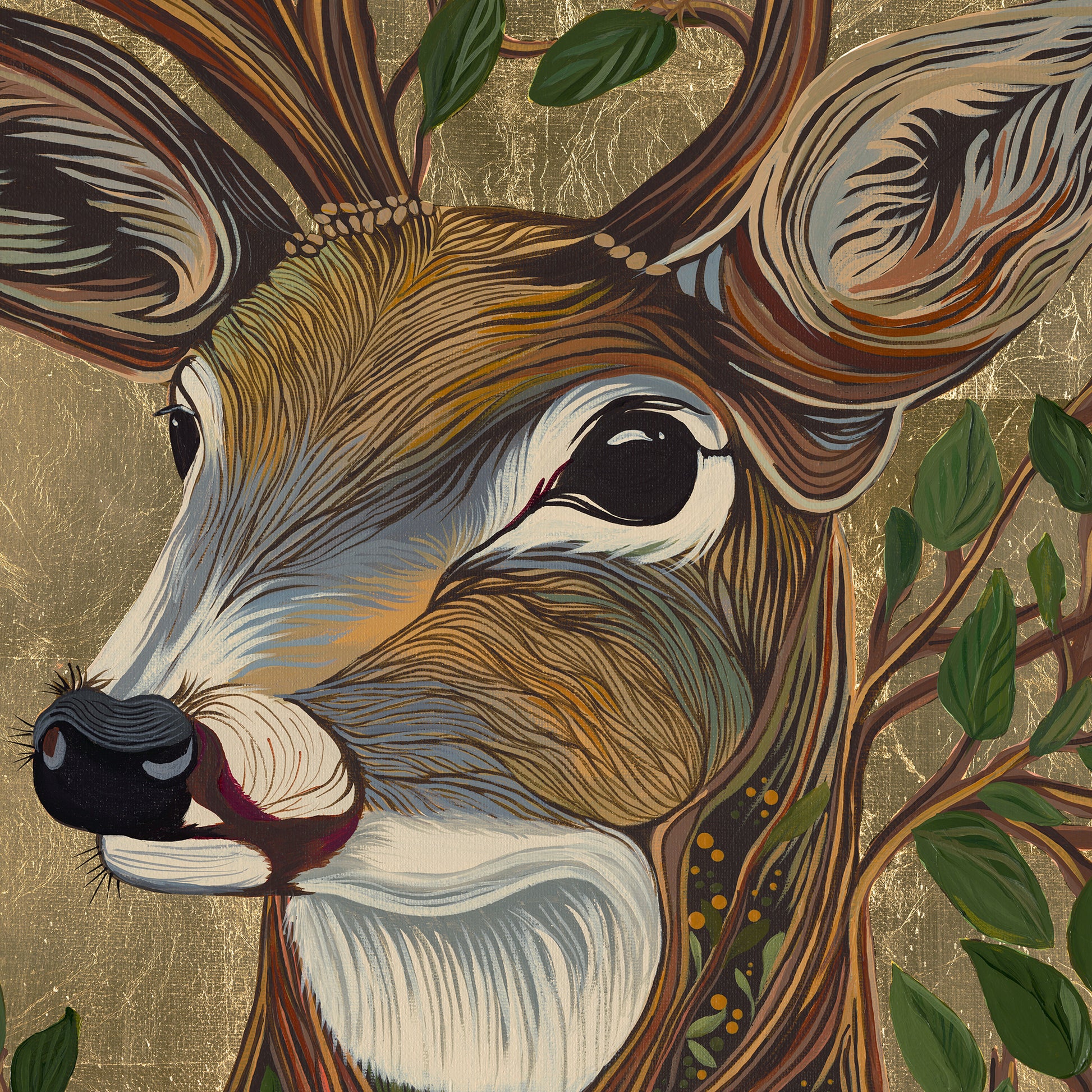 The gold background catches the light softly, adding warmth and depth without demanding attention. Leaves, bark, and feathers bring gentle movement around the figure, but nothing feels hurried or unresolved. This is a painting about presence rather than drama — steady, contained, and quietly confident.