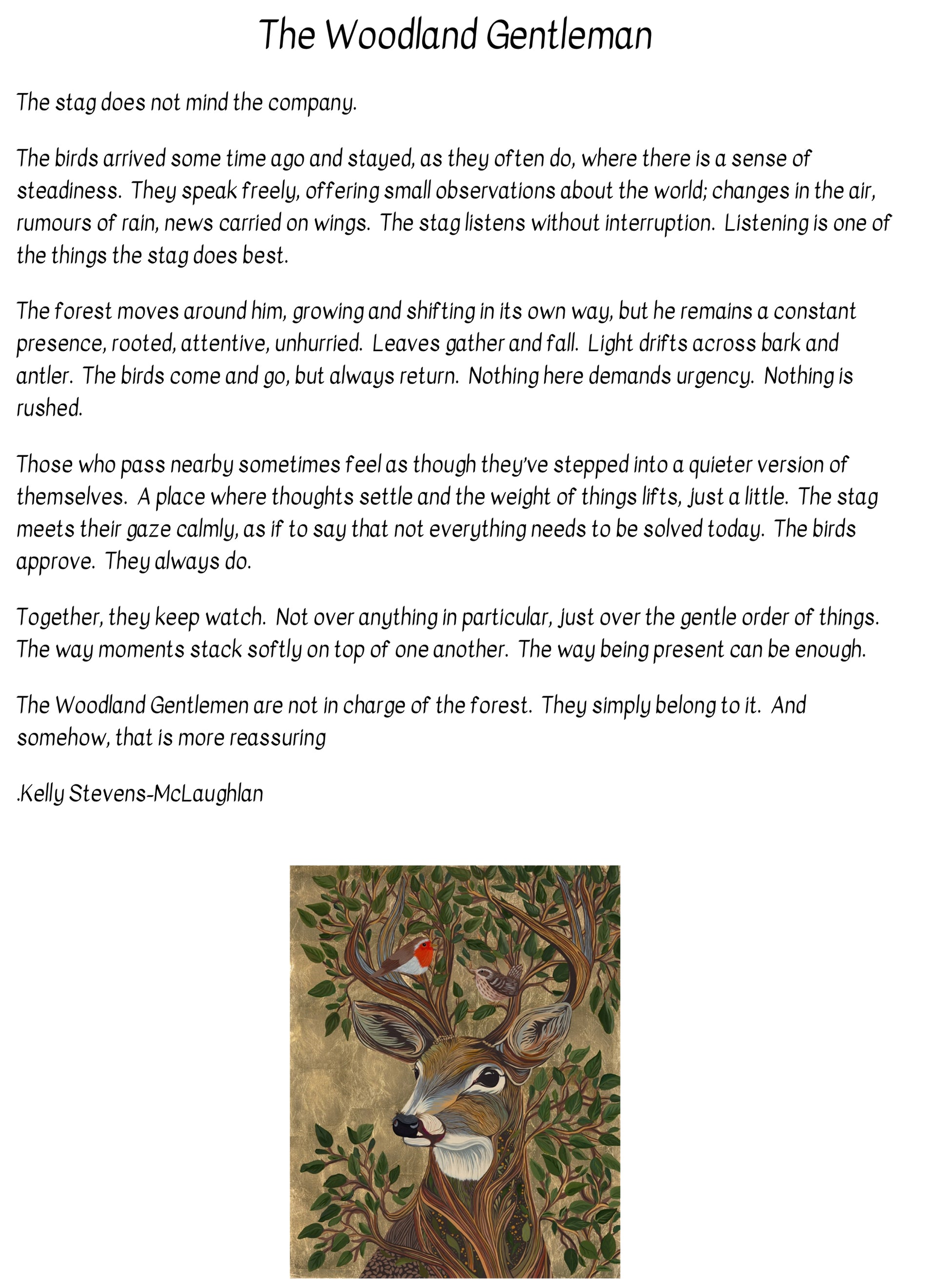 At the centre stands the stag — composed, attentive, and unhurried. His antlers branch into the surrounding woodland, becoming part of the forest itself, while two birds perch above, mid-conversation. There is a sense of quiet listening here, of watchfulness without urgency.