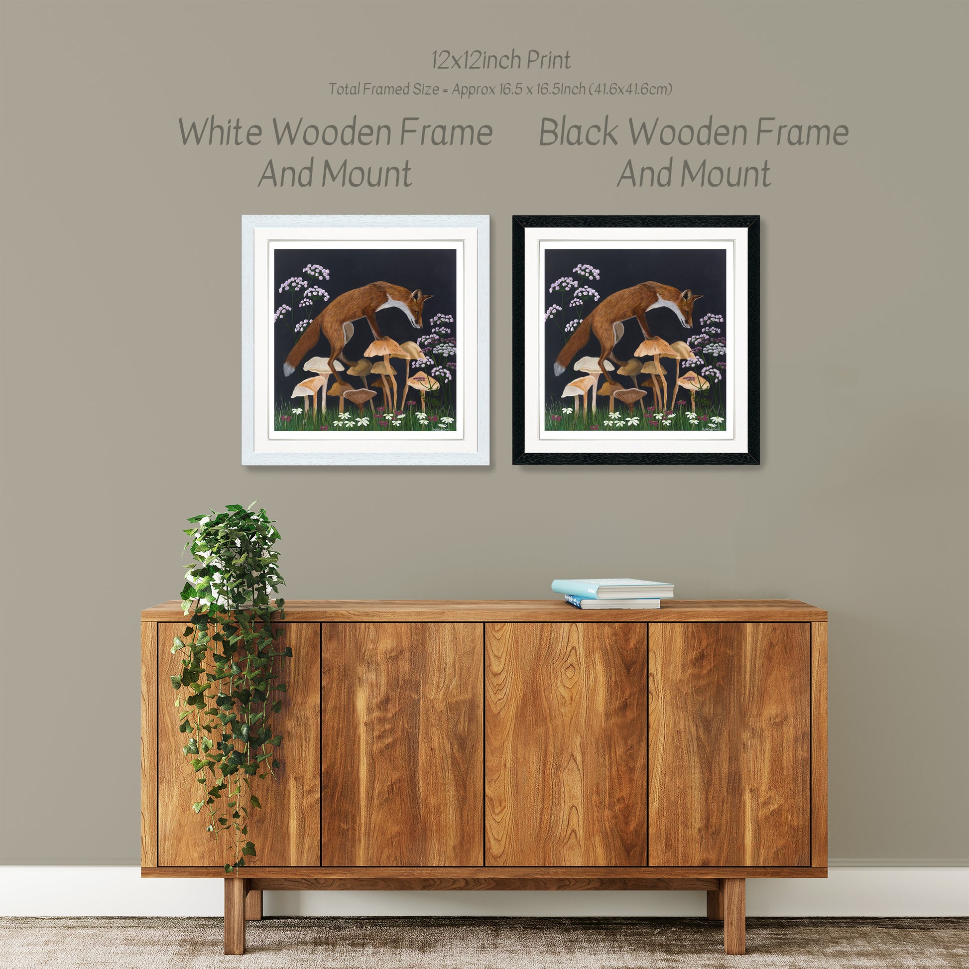 A striking print featuring a fox carefully stepping across a cluster of woodland mushrooms, set against a dark, atmospheric background. Fine detail, natural rhythm, and a sense of quiet focus give the piece a poised, almost weightless feel.