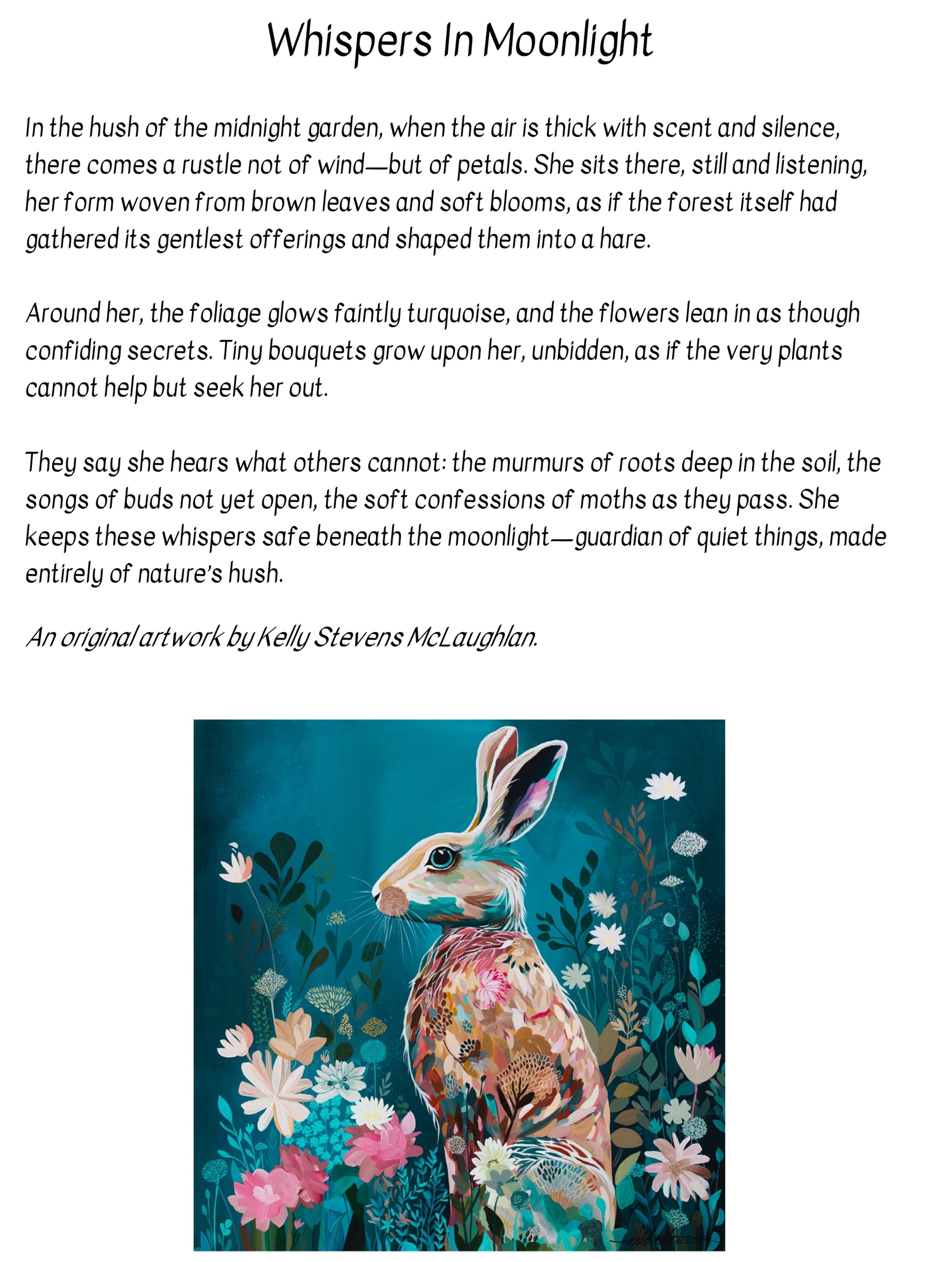 A calm, atmospheric print featuring a hare set against a deep, moonlit background, surrounded by softly layered florals. Rich colour, gentle contrast, and fine detail give this piece a quiet, contemplative feel on the wall.